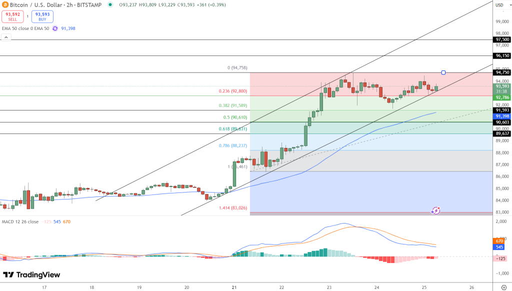 Bitcoin is consolidating just below a major resistance zone at $94,750, the 0% Fibonacci level from the recent $88,461–$94,758 rally. Price action remains within a steep ascending channel, with the 50-period EMA at $91,398 acting as dynamic support.