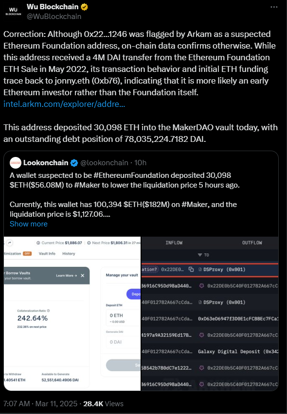 Wu soon posted a correction, stating that the on-chain data shows that the address is not Foundation’s. Instead, he claimed it was likely an early Ethereum investor.