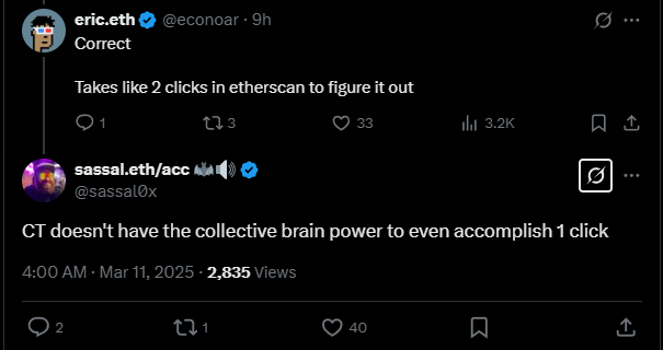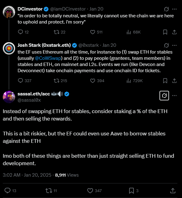 Conner, for example, said in late January 2025 that the EF’s number one use case of the second-largest chain is to “dump ETH.”