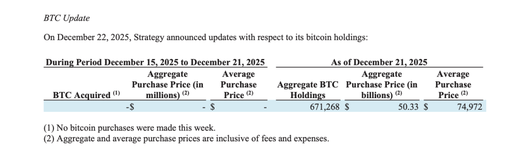 The filing shows that Strategy did not acquire any Bitcoin during the reported period. Its aggregate Bitcoin holdings remained steady at 671,268 BTC as of December 21, with an aggregate purchase price of approximately $50.33 billion.