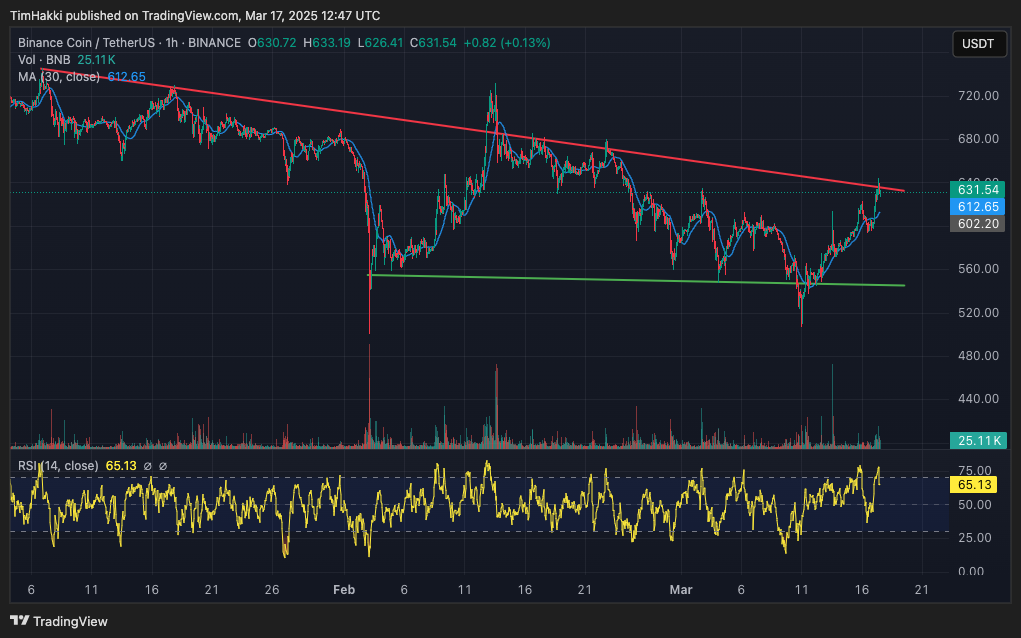 Binance Coin ($BNB) outperformed both Bitcoin and Ethereum with a 4% rise to $625, bringing its weekly gains to 12%.