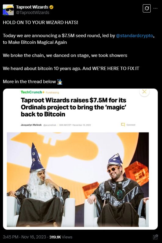 Bitcoin educators and social media influencers Udi Wertheimer and Eric Wall spearheaded the Taproot Wizards project. The duo famously dressed up as wizards at a Bitcoin 2023 conference.