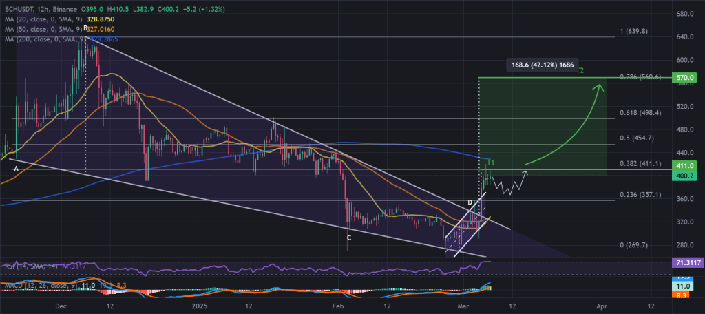 Bitcoin Cash has surged past the $400 mark for the first time since early February, posting a 42.6% weekly gain and ranking among the top-performing altcoins.