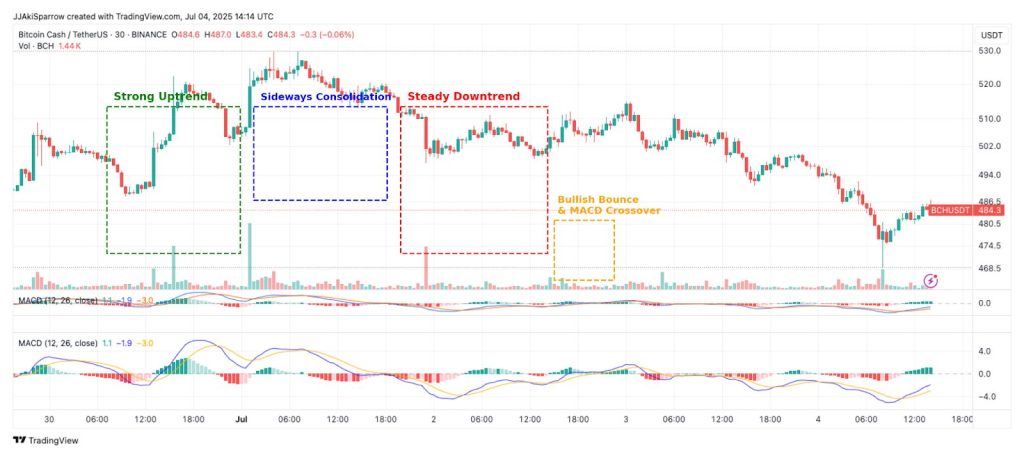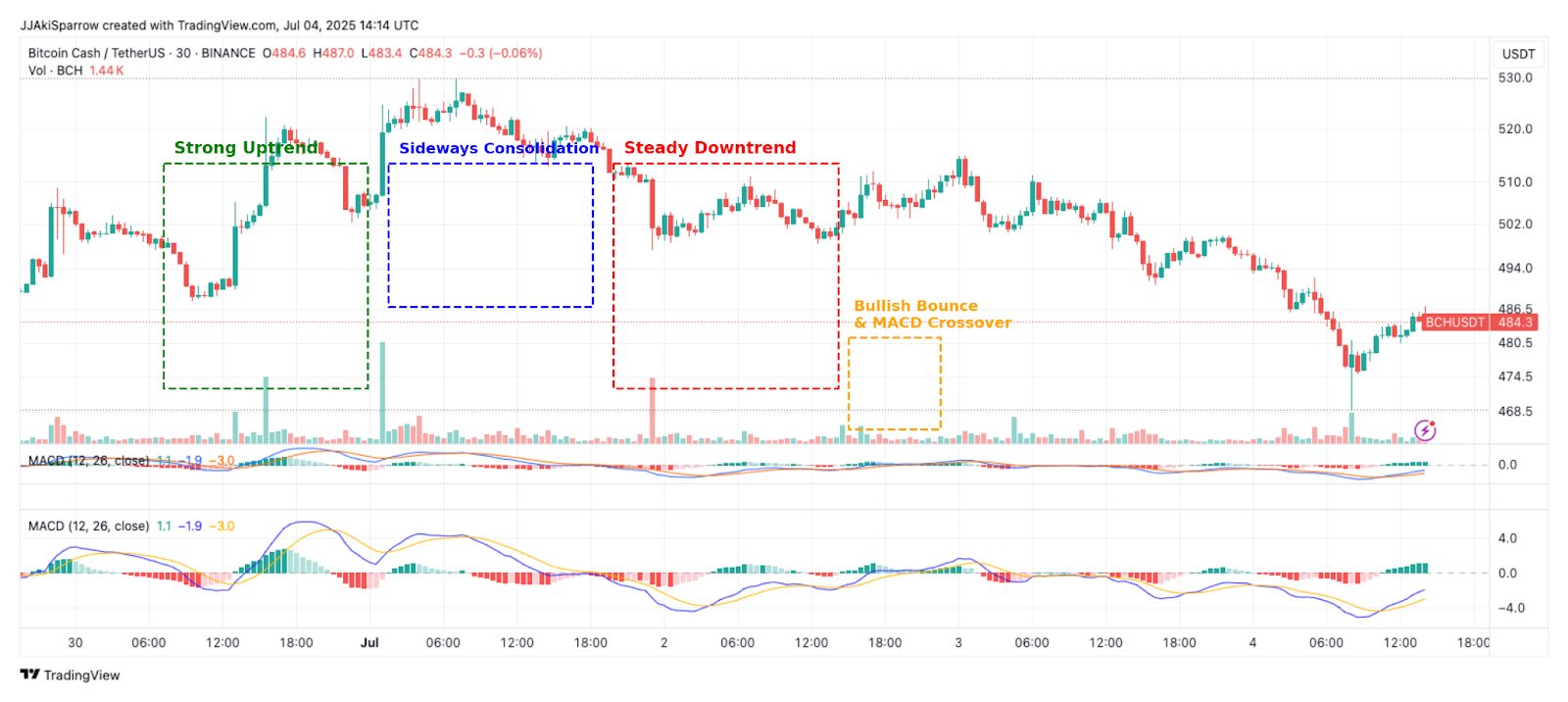 The BCH/USDT chart reflects a clear transition through multiple market phases, beginning in late June and continuing into early July.