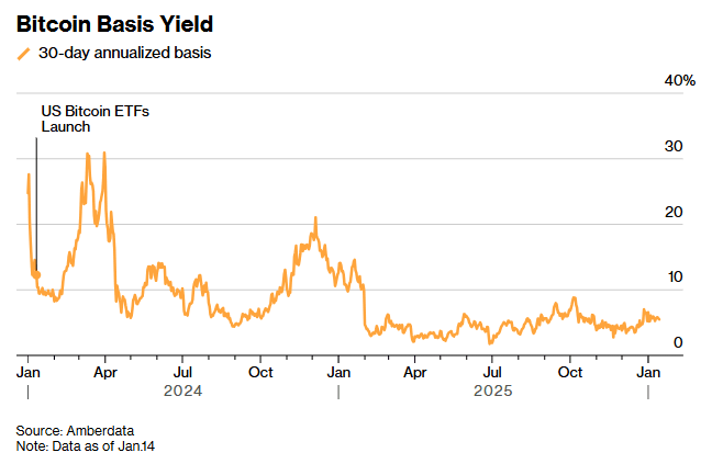 Amberdata shows that yields on the Bitcoin basis trade, a strategy that buys spot Bitcoin via ETFs while selling futures to capture price spreads, have dropped below 5%, down from around 17% a year ago.