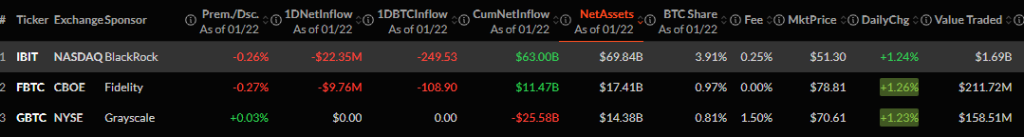BlackRock’s iShares Bitcoin Trust led daily outflows, with $22.35 million redeemed, equivalent to roughly 249.5 BTC.