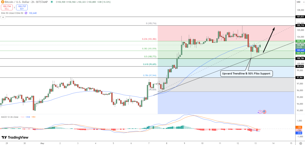 Combined with the upward trendline and 50-period EMA at $102,640, this area forms a strong base of support.