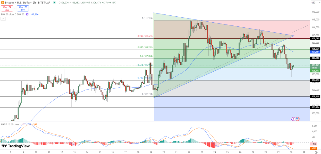 On the technical front, Bitcoin price prediction seems bearish as BTC has dropped below the 61.8% Fibo area. At the moment, Bitcoin is testing the $106,100 zone after slipping from $107,000.