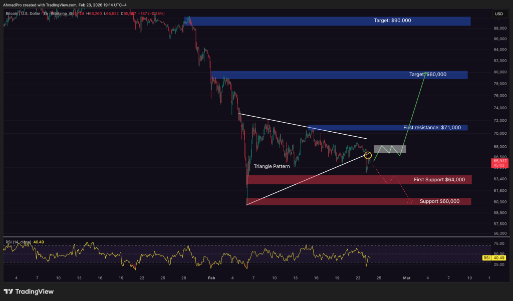 Bitcoin just broke below the lower edge of the triangle. That flips the short-term structure from compression to weakness.