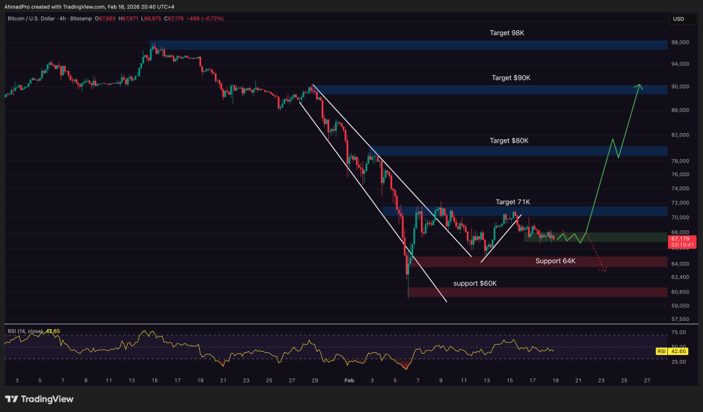 On the chart, price bounced hard from the $60K–$64K demand zone and is now ranging just under the $70K–$71K resistance band.