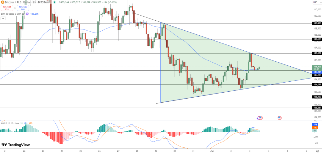 Bitcoin price prediction remains neutral as BTC has formed a tightening symmetrical triangle on the 2-hour chart, with dynamic support from the 50-period exponential moving average (EMA) near $105,295.