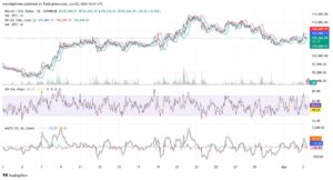 Candlestick patterns, including doji and spinning tops, suggest indecision and potential reversal, while the MACD is turning bullish with an impending crossover.