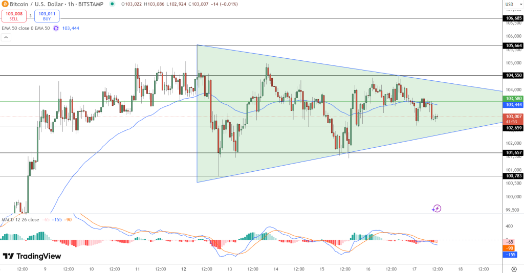 On the 1-hour chart, BTC is forming a symmetrical triangle between $104,550 and $102,659, keeping Bitcoin price prediction neutral. This is a setup for volatility. MACD is slightly bearish but the pattern of higher lows shows bulls aren’t backing down.