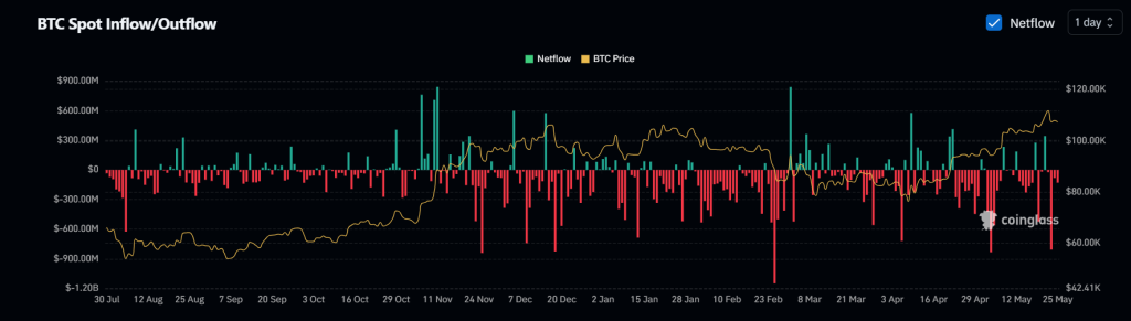 Supporting this, Coinglass data reveals heightened spot exchange activity. On May 23, the BTC spot exchange net inflow heatmap shows Binance leading with $19.87 million in net inflows over a 1-hour window, while Bybit, OKX, Kraken, and Bitstamp saw smaller inflows.