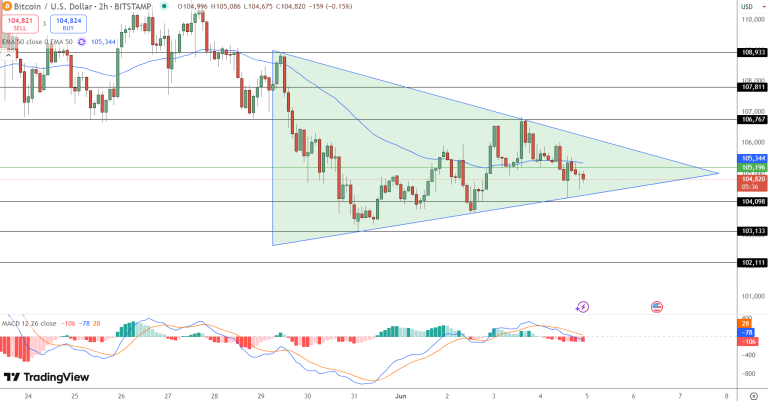 The Bitcoin price prediction is neutral, as BTC is currently locked in a symmetrical triangle pattern on the 2-hour chart, trading just below the resistance level at $105,344. Price action has formed a tightening range of lower highs and higher lows since late May, suggesting an imminent breakout.