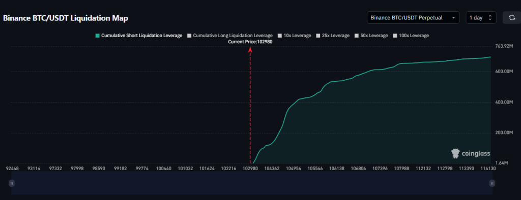 Bitcoin (BTC) experienced another wave of volatility early Tuesday, briefly falling to $102,980 before stabilizing. The decline triggered a spike in forced liquidations, with Coinglass data showing over $730 million in short positions wiped out—marking one of the largest daily liquidation totals in recent weeks.