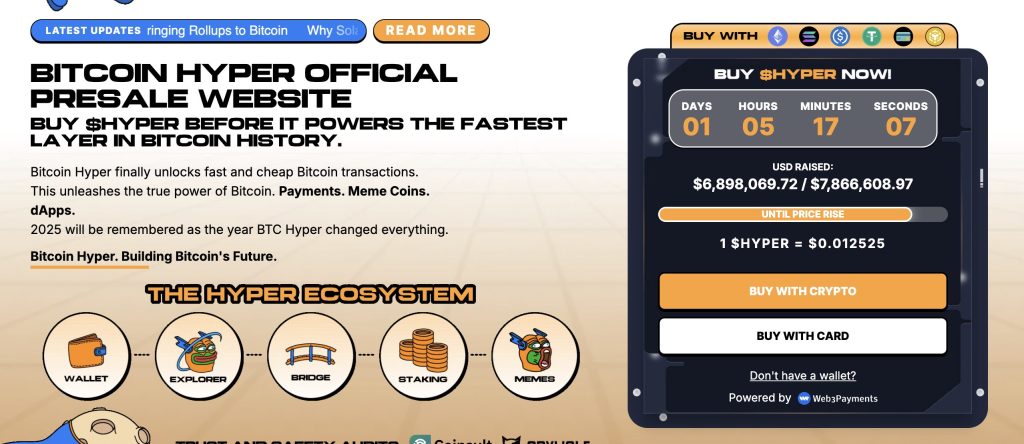 Bitcoin Hyper ($HYPER), the first BTC-native Layer 2 powered by the Solana Virtual Machine (SVM), has raised over $6.8 million in its public presale, with $6,898,069 out of a $7,866,608 target. The token is priced at $0.012525, with the next price tier expected to be announced soon.
