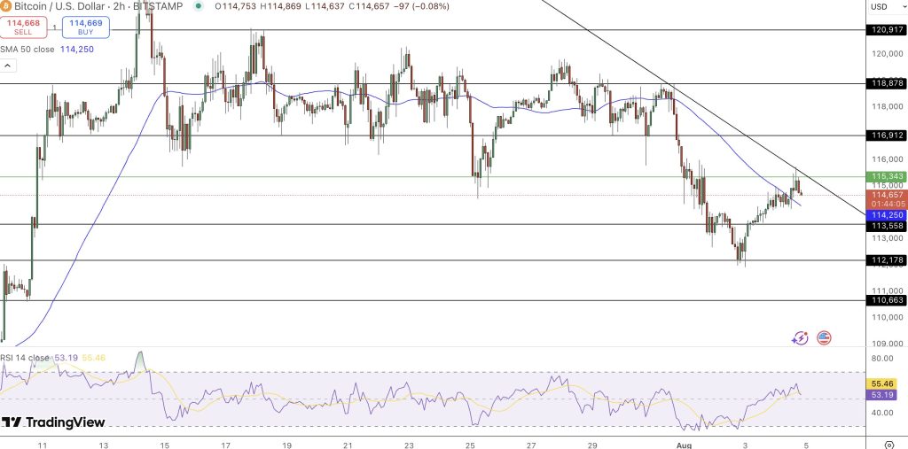 Bitcoin’s recent recovery from $113,000 to $114,650 has stalled beneath key resistance at $115,343, right along a descending trendline. This area is critical: a bullish RSI divergence formed during the bounce, hinting that sellers may be losing steam.