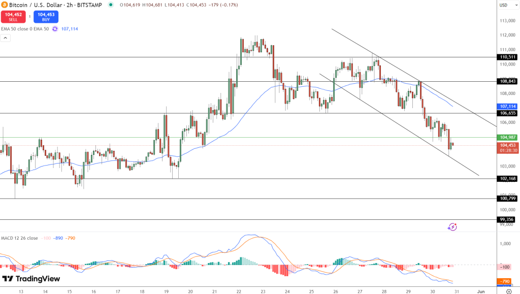 Support is at $102,168, and resistance is near $106,655. If BTC breaks $102,168, it could test $100,799 or $99,356. A bullish reversal – a hammer or morning star pattern, with MACD divergence and EMA crossover – could take it back to $106,655.