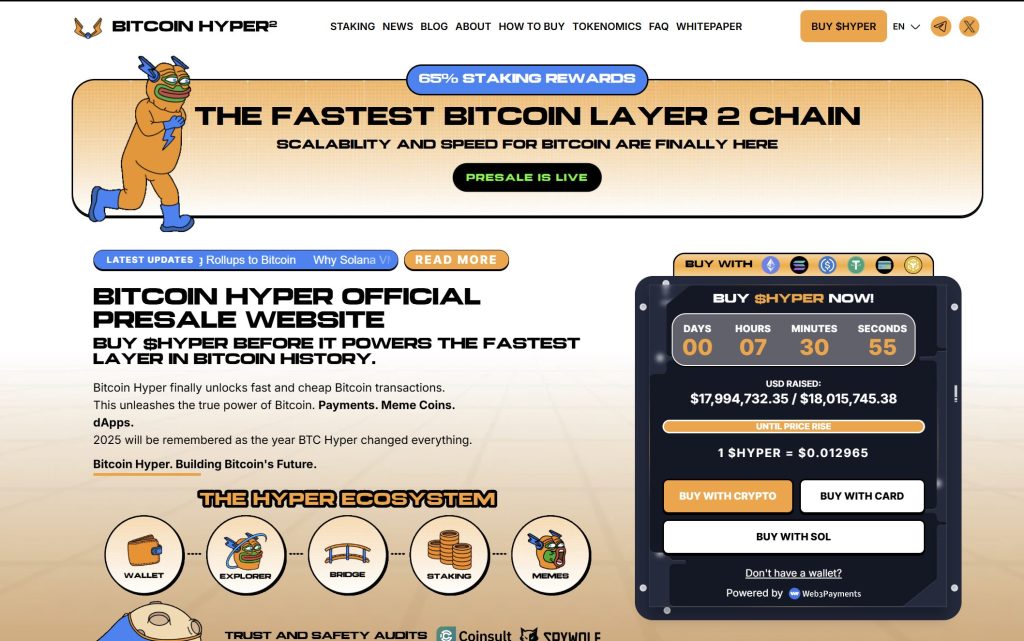 Bitcoin Hyper ($HYPER) is positioning itself as the first Bitcoin-native Layer 2 powered by the Solana Virtual Machine (SVM). Its goal is to expand the BTC ecosystem by enabling lightning-fast, low-cost smart contracts, decentralized apps, and even meme coin creation.