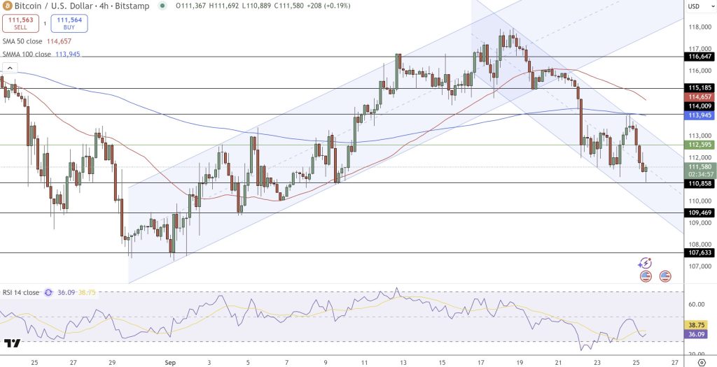 Bitcoin price prediction remains bearish amid descending channel as BTC is failing to hold its September rally. Both the 50- and 100-period moving averages have crossed in bearish alignment near $114,000, underscoring short-term weakness.
