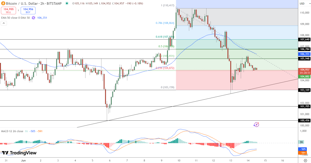 Technically, BTC is hovering just above the 0.236 Fibonacci retracement level at $104,872 and sits on an ascending trendline that has supported price action since early June.