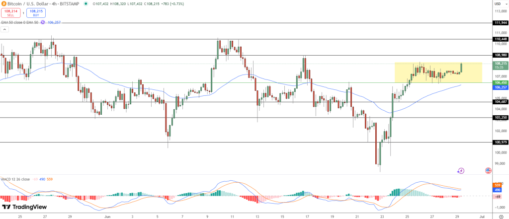 On the technical front, BTC/USD is approaching a breakout after a week of consolidation. Price is at $108,215, testing the upper boundary of the rectangle at $106,450-$108,980.