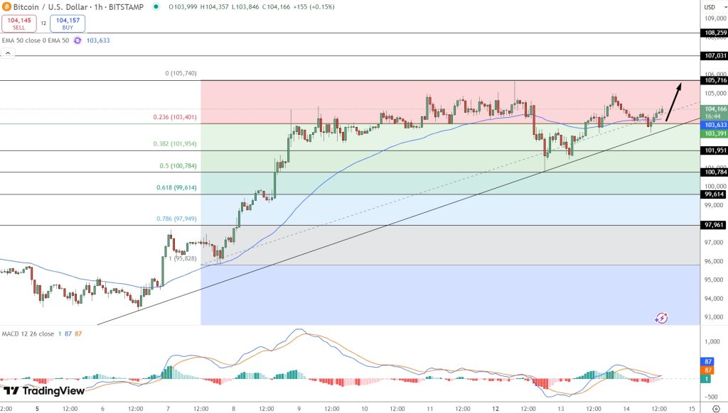 Bitcoin price prediction remains bullish as the BTC/USD is holding firm above the 50-hour EMA at $103,612, with price action showing higher lows from the $95,828 swing. The 38.2% Fibonacci retracement at $101,954 remains an important support level. A bounce from this zone reinforces the strength of the trendline.