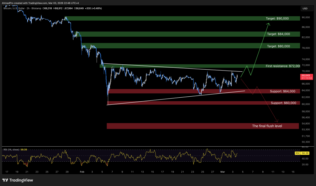 Bulls have one clear invalidation level. A strong 2h or daily close above $72,000, with follow through, breaks the descending resistance and shifts structure. That would open the path toward $80,000, then $84,000 and potentially $90,000.