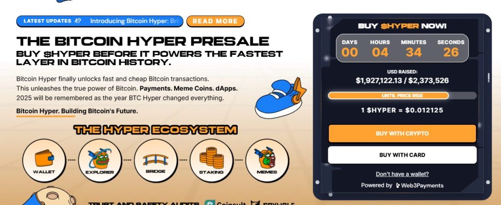 Bitcoin Hyper ($HYPER), the first Bitcoin-native Layer 2 powered by the Solana Virtual Machine (SVM), has surpassed $1.90 million in its public presale, with $1,927,122 raised out of a $2,373,526 target. The token is priced at $0.012125, with the next price tier expected within hours.