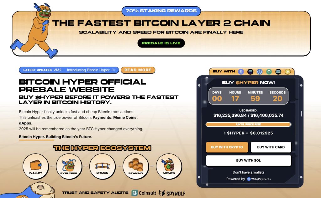 Bitcoin Hyper ($HYPER) is positioning itself as the first Bitcoin-native Layer 2 powered by the Solana Virtual Machine (SVM). Its goal is to expand the BTC ecosystem by enabling lightning-fast, low-cost smart contracts, decentralized apps, and even meme coin creation.