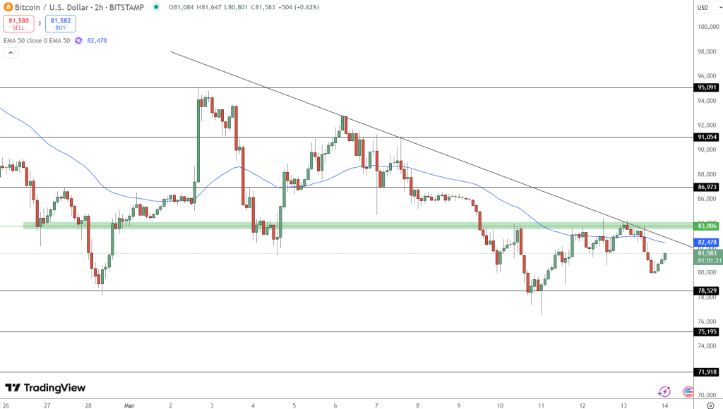Bitcoin (BTC/USD) is trading around $81,580, up 0.62%, after rebounding from key support near $78,500. The price remains below a descending trendline, with resistance at $83,800 acting as a major barrier.