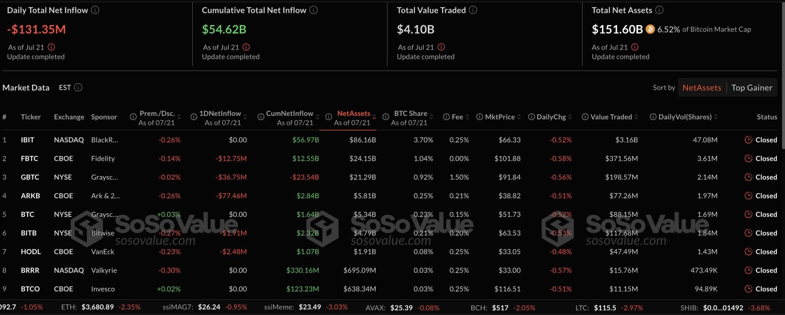 Bitcoin spot exchange-traded funds (ETFs) recorded a net outflow of $131.35m on July 21, ending a 12-day run of continuous inflows, according to data from SoSoValue.
