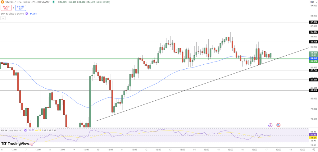 Technically, Bitcoin remains supported by a rising trendline and the 50-period EMA on the 2-hour chart. The $83,800 support zone is holding firm, and RSI has bounced to 51.8—indicating buyers still have room to drive prices higher.