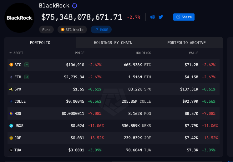 On-chain data from Arkham reveals that BlackRock, the trillion-dollar asset manager, now holds SPX as its third-largest crypto asset, behind only Bitcoin and Ethereum.