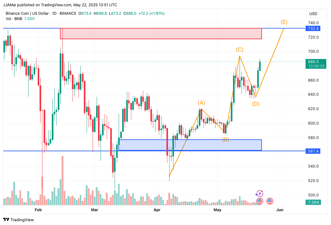 The chart shows $BNB completing a corrective pattern from $720 down to $520 lows and now appears to be in recovery mode.