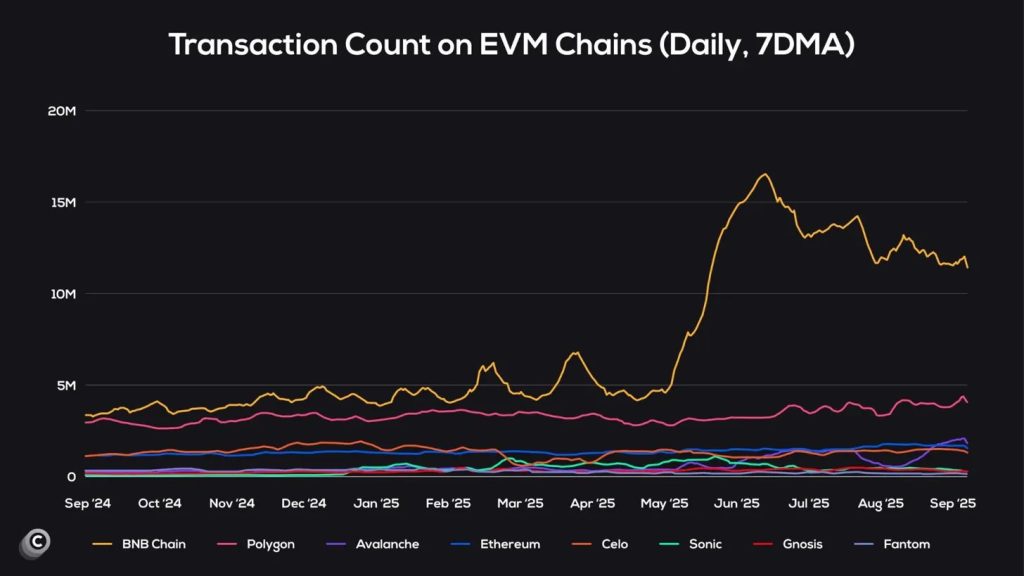 BNB Chain processes over 10 million daily transactions, maintaining 2-3 times the volume of nearest EVM competitors, including Polygon, Avalanche, and Ethereum Layer-2 solutions.
