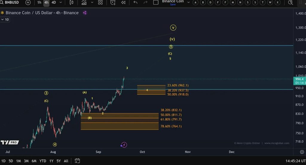 Technical analysis reveals BNB completing a five-wave Elliott Wave structure with Fibonacci projections targeting $1,200 as the next major resistance level.