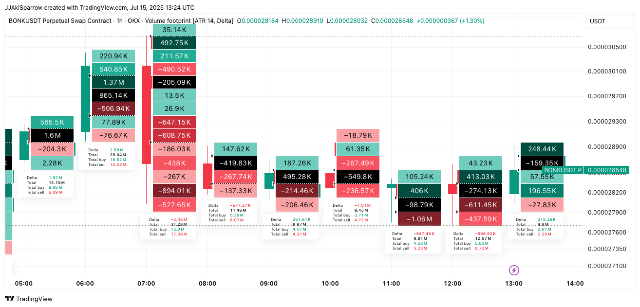 The 1‑hour footprint chart adds context to recent order flow. Earlier candles show large buying deltas, such as +2.59M on a candle with total buys at 15.82M against 13.23M sells, which propelled the $BONK price higher.