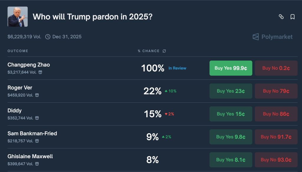 Other potential pardon candidates on Polymarket include Roger Ver at 17% odds, while CZ remains Binance’s largest shareholder with a 90% stake and an estimated net worth of $75 billion.