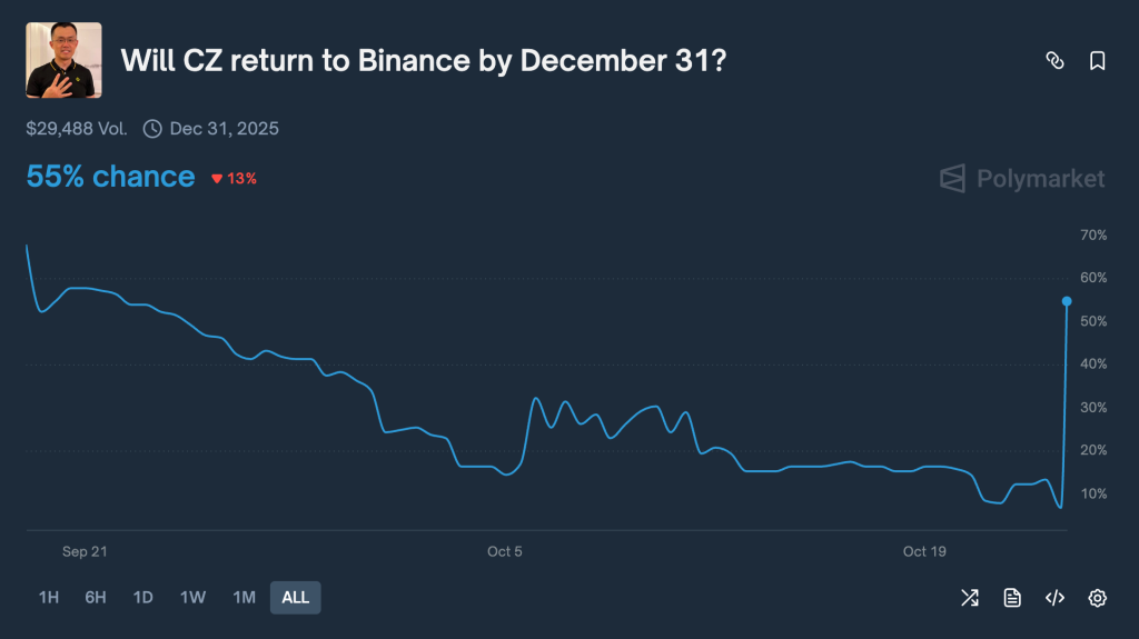 Polymarket odds for CZ receiving a pardon stood at 100%, while prediction markets show his chances of returning to Binance by December 31 surged from 7% to 55% within minutes of the announcement.