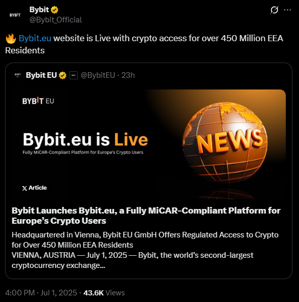 This launch, the announcement claims, “marks a major milestone in Bybit’s mission to provide secure, transparent, and fully compliant digital asset trading in Europe.”