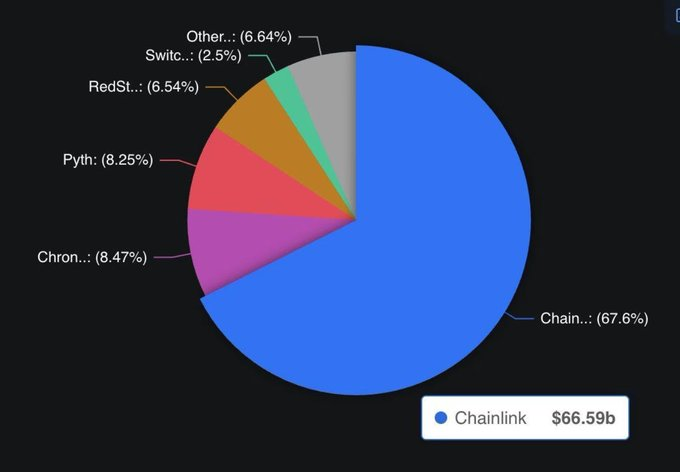 This sustained activity has further cemented Chainlink’s dominance in the oracle sector of DeFi, where it currently secures more than 68% of the total oracle TVL, with $66 billion in Total Value Secured (TVS).