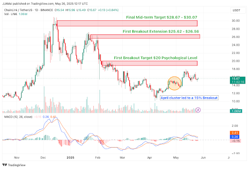 Beyond that, the mid-term price target is between $28.67 and $30.07, coinciding with highs observed in late 2024.