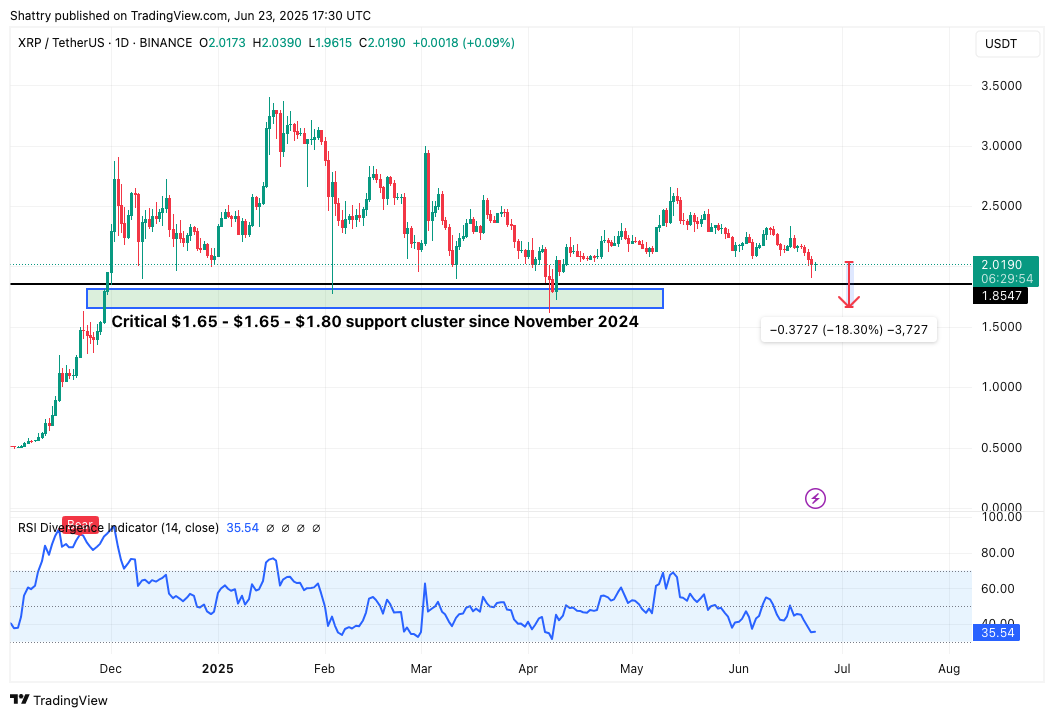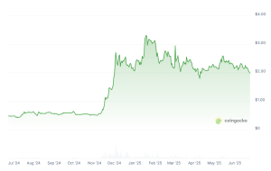 May witnessed a sharp decline, with support emerging at $1.80, followed by June’s volatile recovery between $1.79 and $2.10. The June 10 low at $1.79 represents a key psychological level, with current prices holding approximately 12% above this threshold.