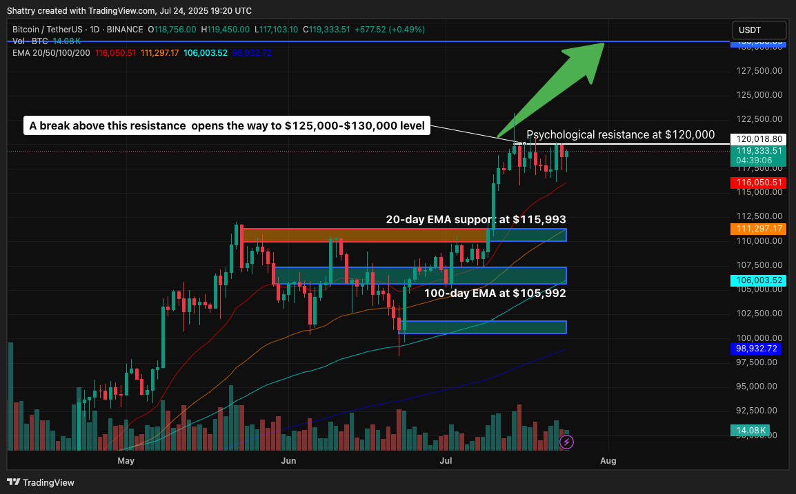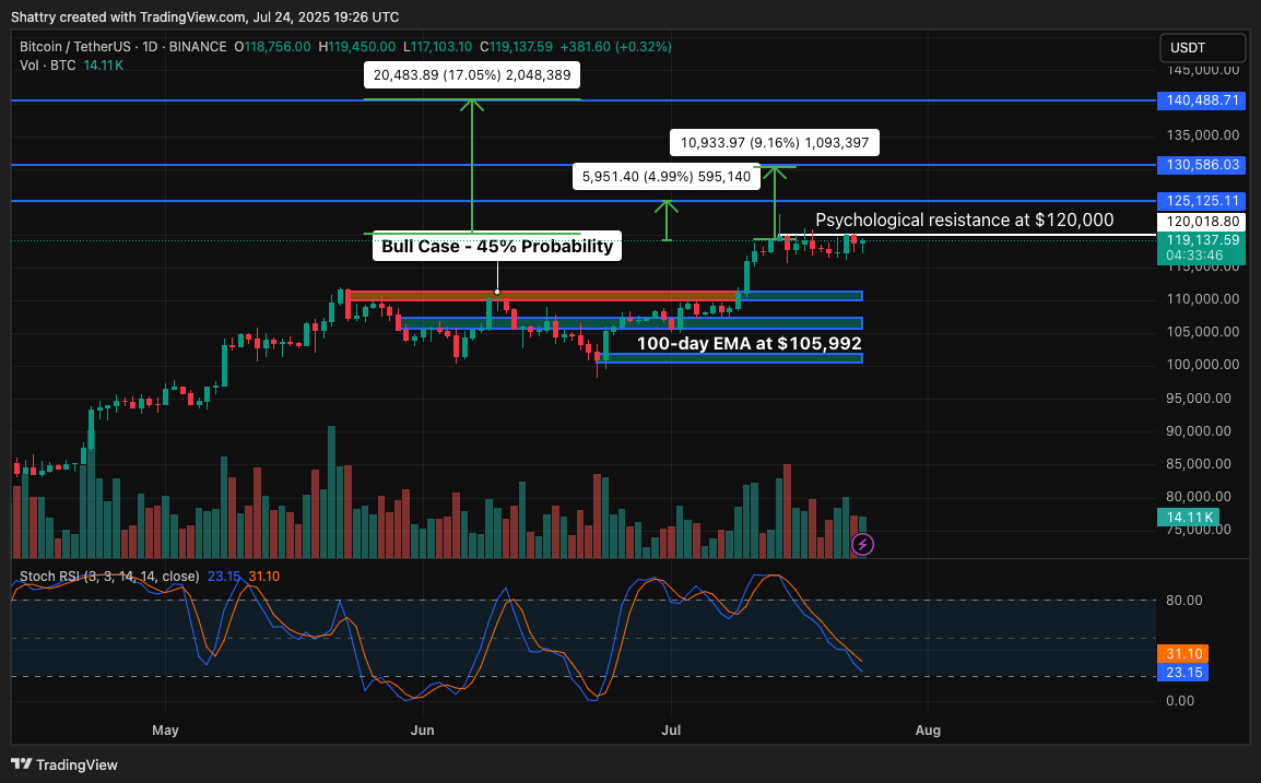 Bitcoin’s current price of $118,688 reflects a minimal 0.06% daily movement, representing healthy consolidation after reaching a historic all-time high of $123,091 on July 14.