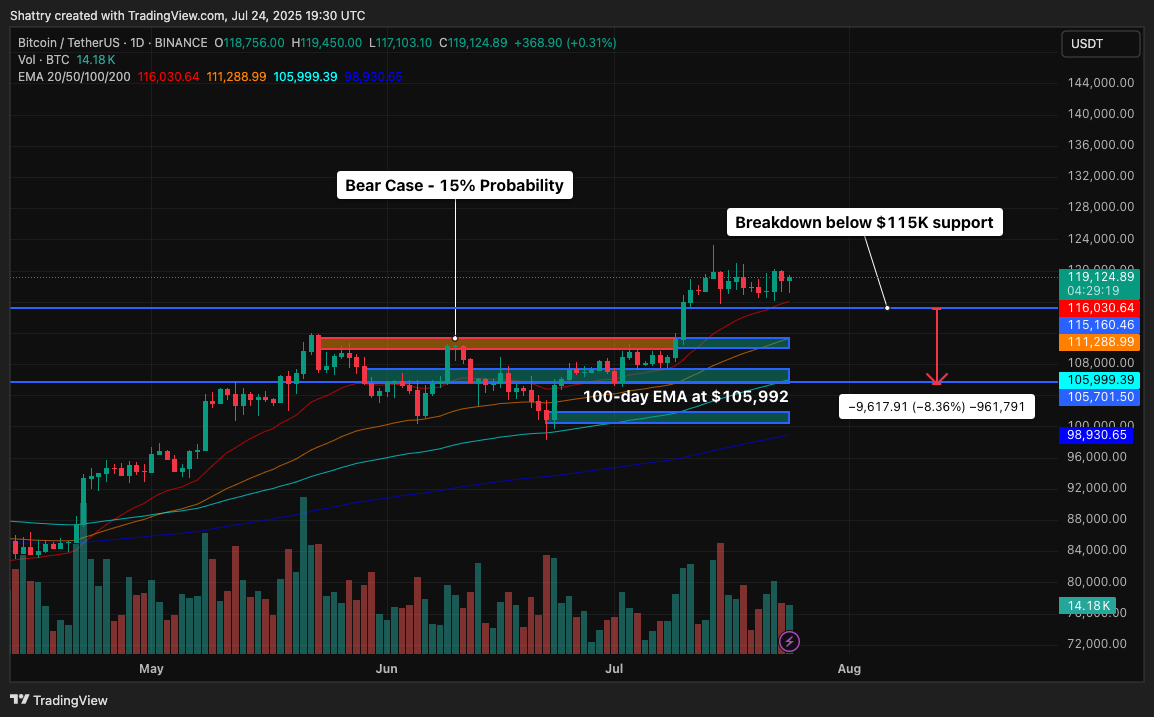 Breaking below the $115K support level could trigger a deeper correction, potentially targeting the $105K-$110K range, representing an 11-17% downside.