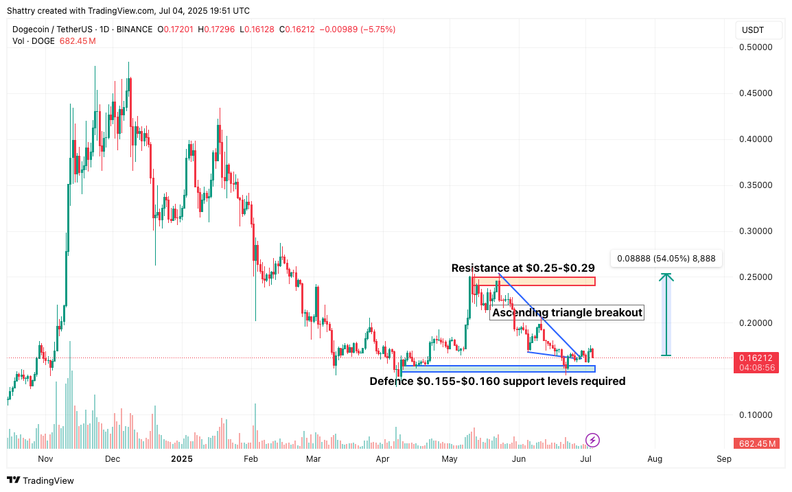 Resolution of Musk-Trump political tensions, combined with a breakout from an ascending triangle, could drive the recovery toward $0.25–$0.29, representing a 54–79% upside.