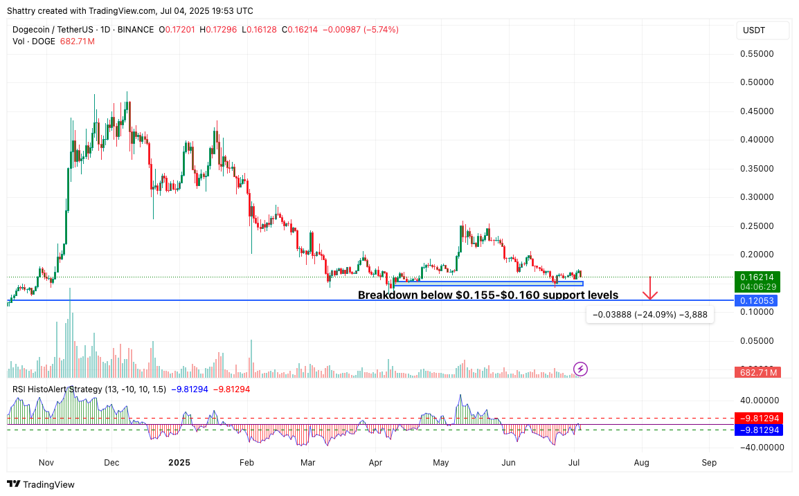 Current consolidation around $0.16 with critical support at $0.155–$0.160 creates a decision point for DOGE’s trajectory. The combination of political drama, technical weakness, and community optimism positions DOGE for volatile price action as catalysts develop throughout Q3 2025.