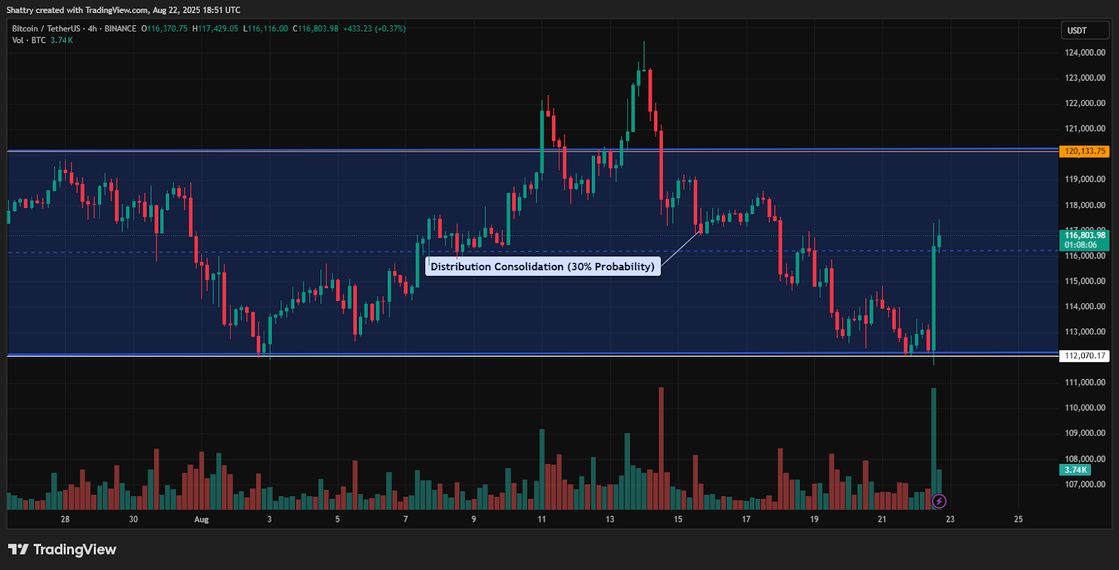 Continued institutional profit-taking could result in consolidation between $112K–$120K, allowing distribution completion while monetary policy provides underlying support for risk asset positioning.